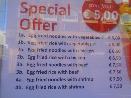Ein großes Menu bei Mc Donalds kostet in den Niederlanden unter 8 Euro. Auch andere bekannte Ketten wie Burger King, Subway und Kentucky Fried Chicken sind günstig und weit verbreitet. Zudem gibt es arabische und türkische Imbissbuden wie bei uns (Kebab-Buden). Sehr gerne gehen wir in asiatische Lokale. Dort gibt es oft Reise oder Nudeln mit Gemüse, Fleisch und leckere Soße für deutlich unter 10 Euro.